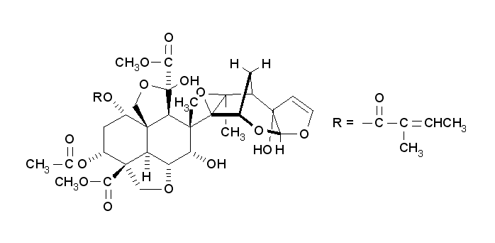 生化機(jī)理 Triterpenoid found in need tree seeds, azadiractin suppresses feeding by many insect species and disrupts growth of most insect and other arthropod species, while having very low mammalian toxicity. Promising as a natural pesticide.